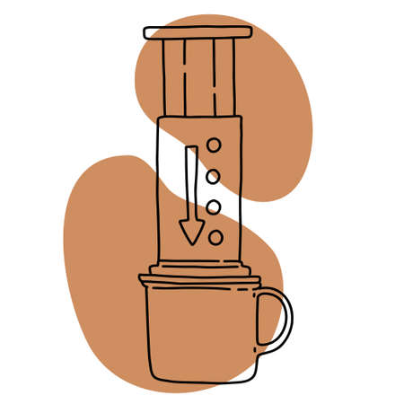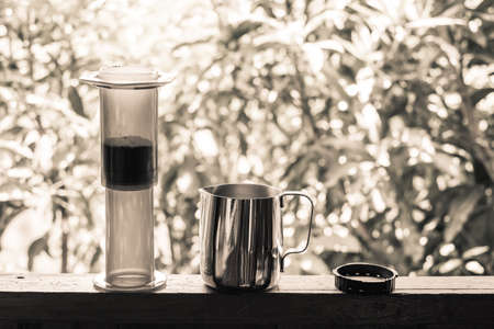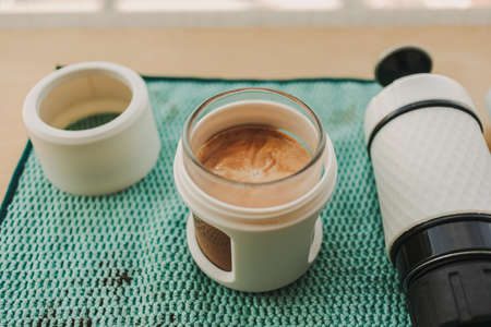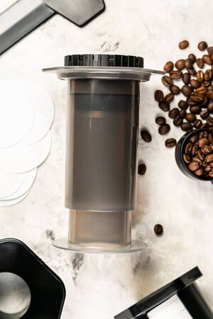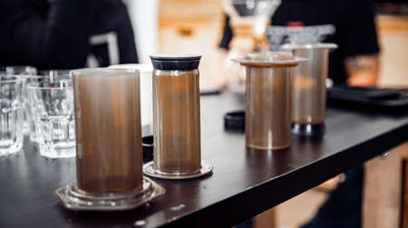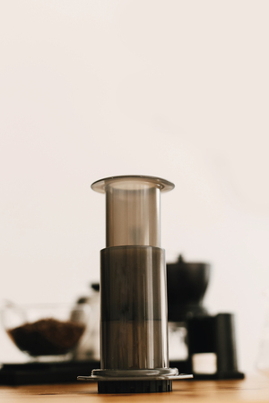 Coffee aeropress creams close-up. Alternative coffee brewing method. Aeropress device on the table. Advert for social networks of restaurants, cafe.