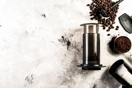 Coffee concept - beans, ground, instant, capsules, aeropress marble background top view