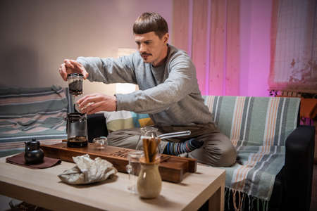 A young man is introduced to the Chinese culture of tea drinking. Brews fragrant raw tea at home. Pour boiling water over tea leaves
