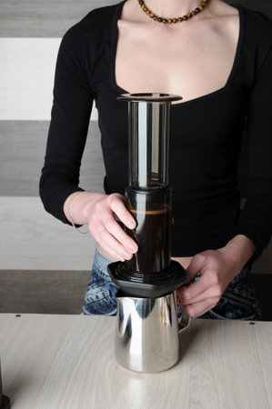 Barista is pushing aeropress for pouring coffee drops trought aeropress to pot. Alternative scandinavian coffee brewing method. Aeropress coffee