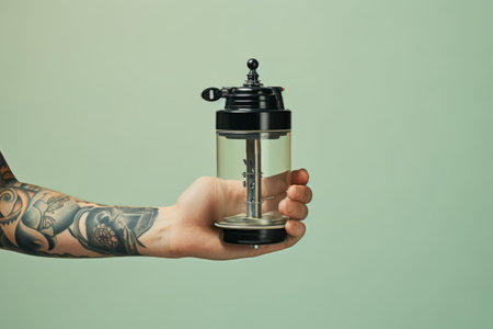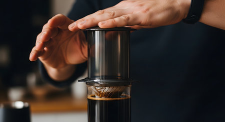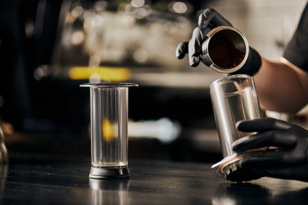 barista in black latex gloves pressing ground coffee in aero press, alternative brewing method