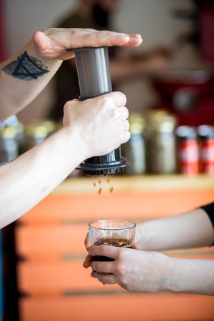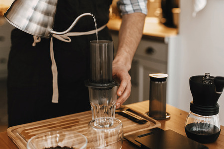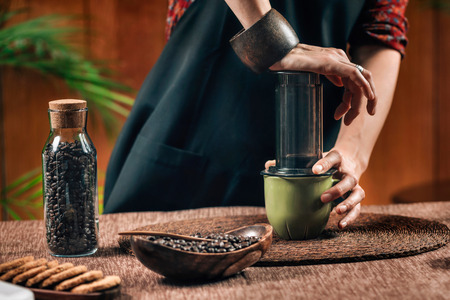Aeropress coffee. Barista is pushing aeropress for pouring coffee drops trought aeropress to pot. Alternative scandinavian coffee brewing method