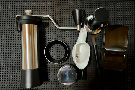 Espresso french press with coffee grinder equipments on grey background.