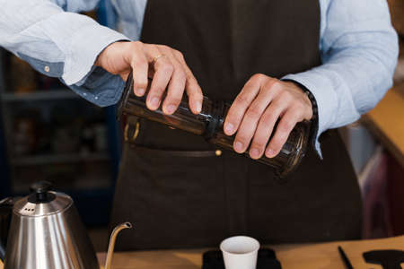 Professional barista preparing coffee alternative method, close-up