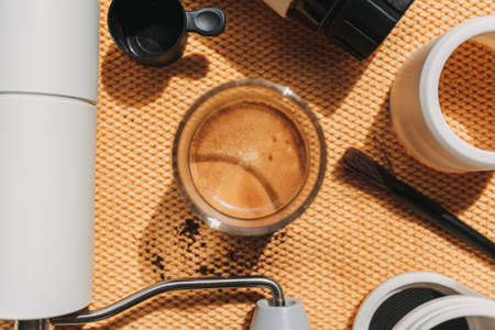 Espresso coffee with french press coffee maker and grinder equipments.