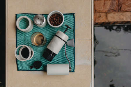 Travel manual coffee machine set, Green bokeh background, Nature
