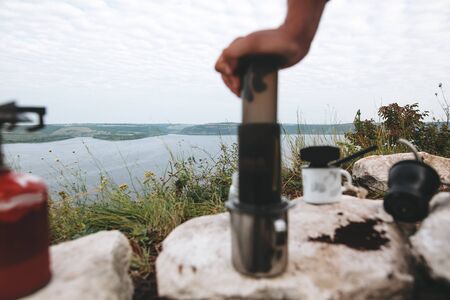 Focus on grass on cliff and blurred image of traveler pressing aeropress on metal mug on cliff at lake, brewing alternative coffee at camping. Making hot drink at picnic outdoors