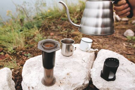 Brewing alternative coffee at camping. Traveler pouring hot water from steel kettle in aeropress on cliff at lake. Making hot drink at picnic outdoors. Trekking and hiking in mountains