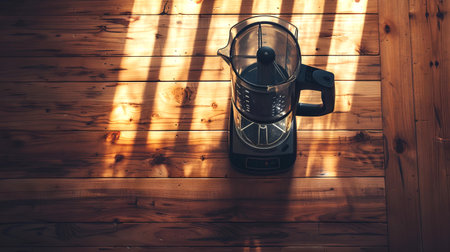 Overhead View of Modern Stationary Blender on Wooden Surface in Warm Sunlight. Concept of Kitchen Appliances, Home Cooking, Sunlit Interiors, Contemporary Design. Copy space.