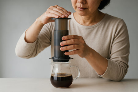 Woman brewing fresh coffee using hand pressed device and glass carafe in a minimalist home kitchen setting.