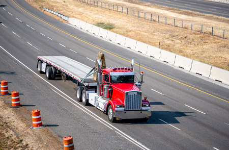 Classic bonnet red semi truck with additional side lights and tall chrome exhaust pipes transporting cargo on flat bed semi trailer running on the highway road to warehouse for delivery unload