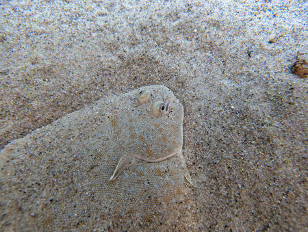 A flatfish blends seamlessly into the sandy seabed, showing its expert camouflage. This spectacular view highlights the beauty of marine life in tropical waters, captured during a dive.