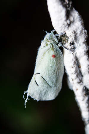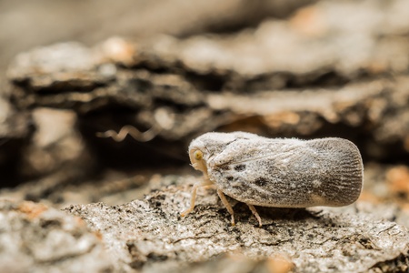 Flatid planthopper, or Moth bugs, wedge-shaped cicadas are small insects. An adult clings to a tree branch. The wings are opaque and are white.