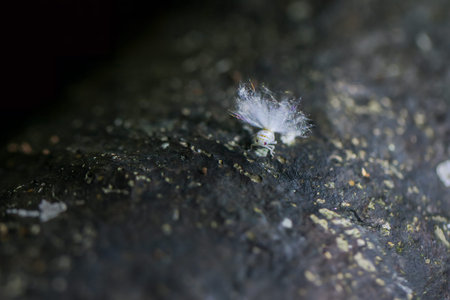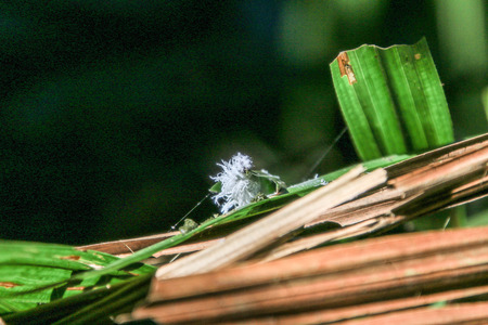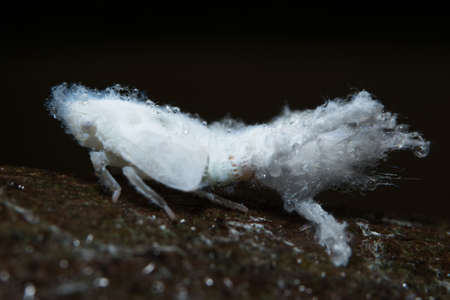 A macro shot of a Ricanoides flabellum nymph, showcasing its unique fluffy white appearance. The nymph is covered in waxy filaments, giving it a soft, feathery look. Taiwan.