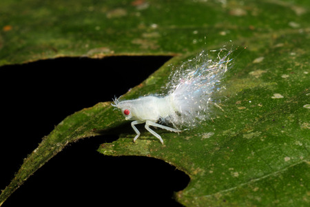 Close up of white Planthopper nymph standing on green tree branch with nature background, macro concept and selective focus.