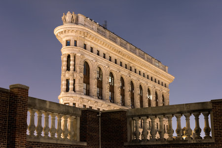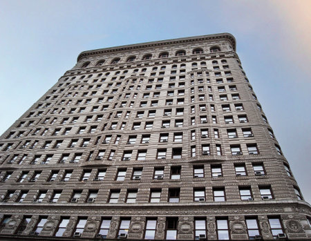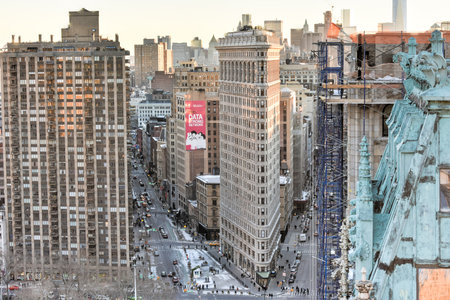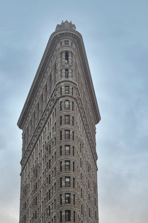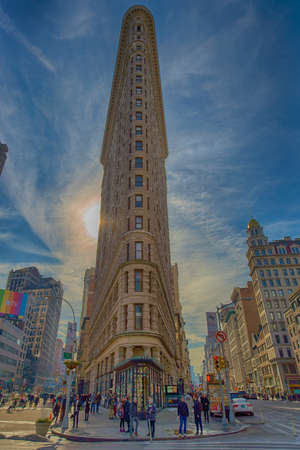 NEW YORK, USA - MARCH 24, 2017: The Flatiron Building is a triangular 22-story steel-framed landmarked building in the borough of Manhattan, New York, is considered to be a groundbreaking skyscraper.