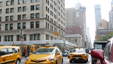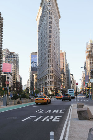 NEW YORK CITY, USA - MARCH 15, 2020: Taxi and Flatiron Building in New York City, USA