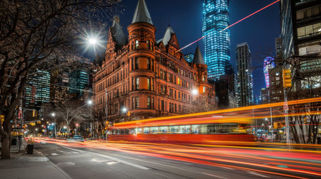 A vibrant nighttime cityscape showcasing a blend of historic architecture and modern skyscrapers. Light trails from moving traffic create a dynamic atmosphere in the urban setting.