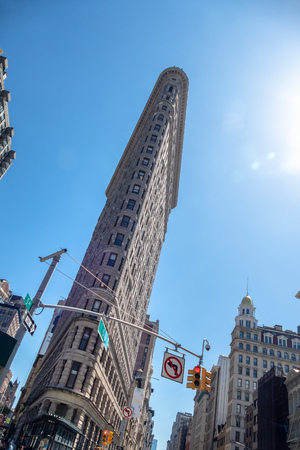 New York City - SEP 11: Flatiron Building panorama closeup on September 11, 2015 in New York City. It is one of the most iconic skyscrapers and the symbol of New York City.