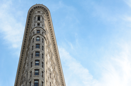 NEW YORK - OCTOBER 22, 2017: The narrow end of the Flatiron Building, formerly known as the Fuller Building, with copy space against a blue sky.