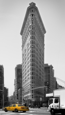 Flatiron building black and white view, with a colored taxi (cutout)