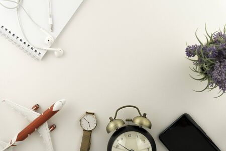 Time for Travel accessories and objects on White background copy space, For Beach Vacation Journey with plane camera notebook, For Travel poster and banner advertisement