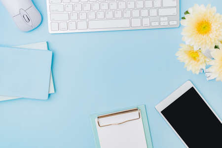 Flat lay blogger or freelancer workspace with a keyboard, flowers in a vase, office supplies on a color background