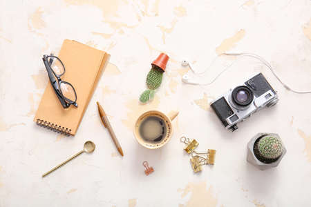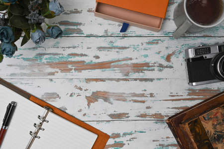 Top view empty notebook, camera and coffee cup on photographer workspace.