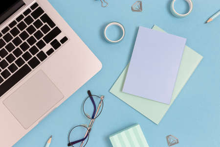 Flaylay of laptop, glasses and stationery on a blue pastel background. Workspace concept with office supplies.