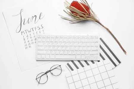 Computer keyboard with notebooks, eyeglasses and calendar on white background