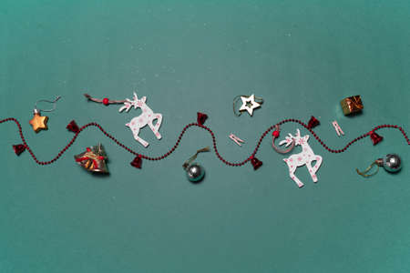 Christmas background with decorative toys of deers and giftsongreen background.