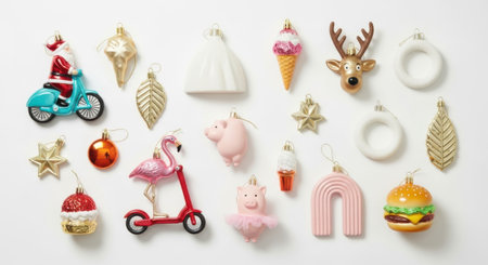 A vibrant assortment of unique and playful Christmas tree ornaments, including a Santa on a scooter, a flamingo on a scooter, ice cream cones, a hamburger, and various decorative shapes, all set against a clean white backdrop.