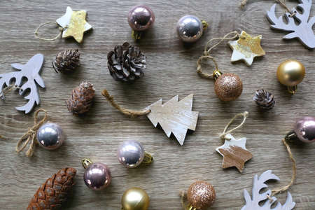 Various wooden Christmas ornaments, golden baubles and pine cones on wooden background. Flat lay.
