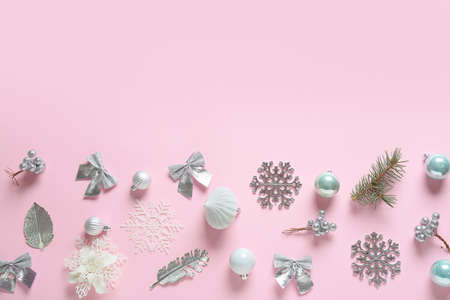Christmas and New Year. Pink flat lay pattern with snowflakes, Christmas toys and cones
