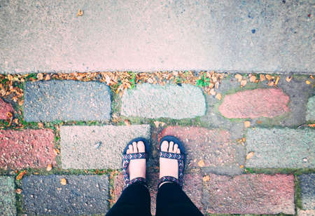 Selfie of feet and shoes on pavement background with copy space, top view