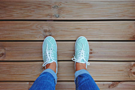Female legs in denim jeans pants and light summer sneakers standing on wooden floow.