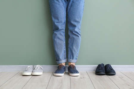Young man with different stylish shoes near color wall