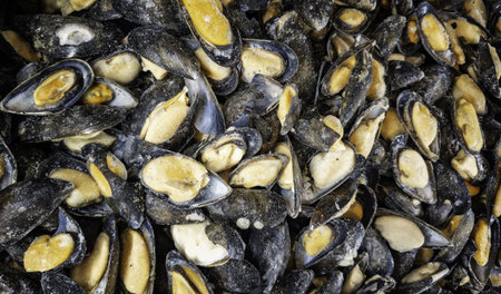 Frozen mussels in fishmongers, sale and food trade