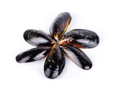 Half-opened mussel shellfish on white background