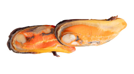Side view of two cooked green mussels in meat in pile is isolated on white background with clipping path.