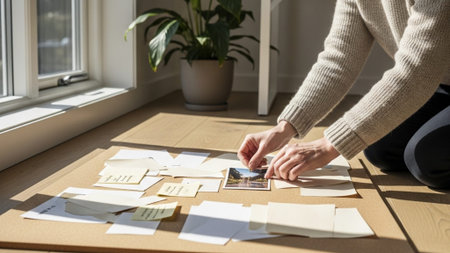 Hands carefully arrange a collection of polaroid-style photos on a wooden table next to an open album. The image evokes nostalgia, memory keeping, and the joy of organizing personal moments.