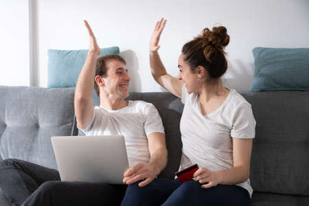 Happy couple celebrating their online shopping purchase.
