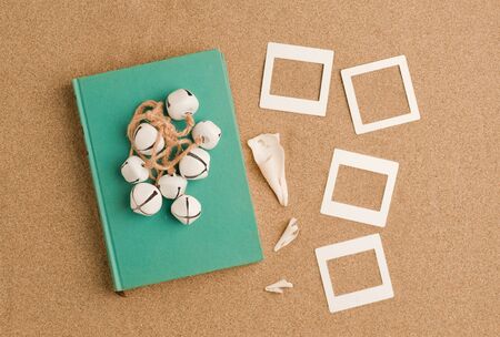 vacation, travel and summer vacation concept: heavenly book with sea shell on the beach sand Set of square photo frames. Photographic design illustration