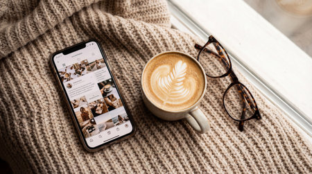 Smartphone with social media app, latte art coffee and glasses on beige knitwear. Cozy winter morning lifestyle scene perfect for blogging and social media content.