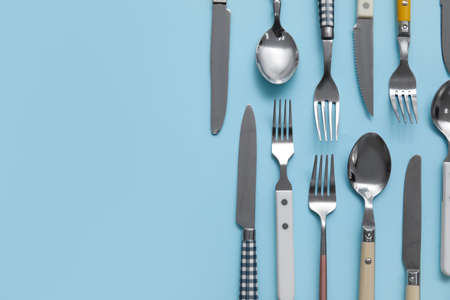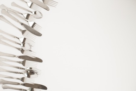 Silvery, minimalistic cutlery on a bright and even, colored background.