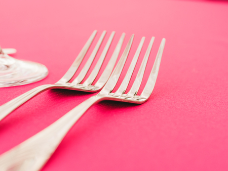 Cutlery on purple wedding table close up. Two forks on purple tablecloth macro shot