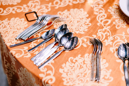 Polished metal forks and spoons are neatly arranged on a vibrant orange tablecloth with an intricate pattern, ready for a special meal or event. This image captures the elegant preparation of a