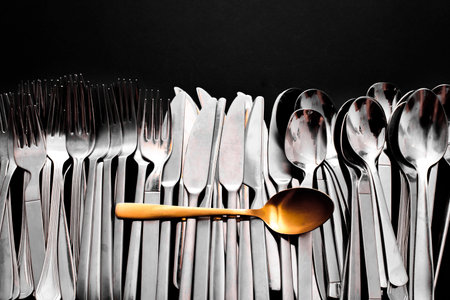 A luxury golden spoon stands out from the rest of the simpler and cheaper cutlery, isolated on a black background with copy space.