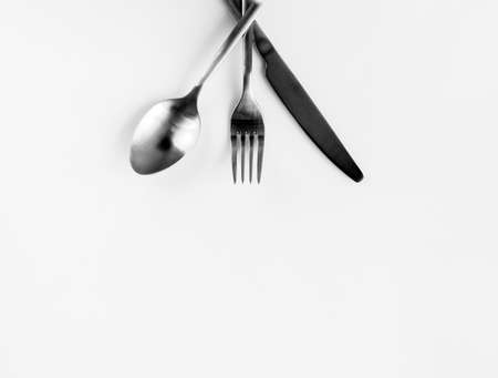 Silver fork, spoon, knife isolated on white. Flat lay, top view. copyspace.