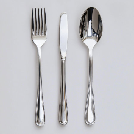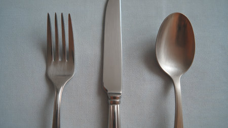 A polished set of stainless steel cutlery featuring a fork, knife, and spoon, ideal for showcasing dining elegance and modern table settings in any culinary environment.